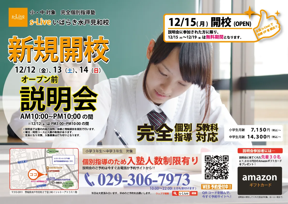 茨城県水戸市に、新しい学びの場「個別指導塾s-Liveいばらき水戸見和校」が12月15日に開校します。このてっぺんを迎える新しい個別指導塾は、東大生などの優秀な大学生講師による指導を特徴としており、特に小・中学生の成績向上を目指します。開校に先立ち、12月12日から14日の3日間にわたり、開校前説明会を開催予定です。