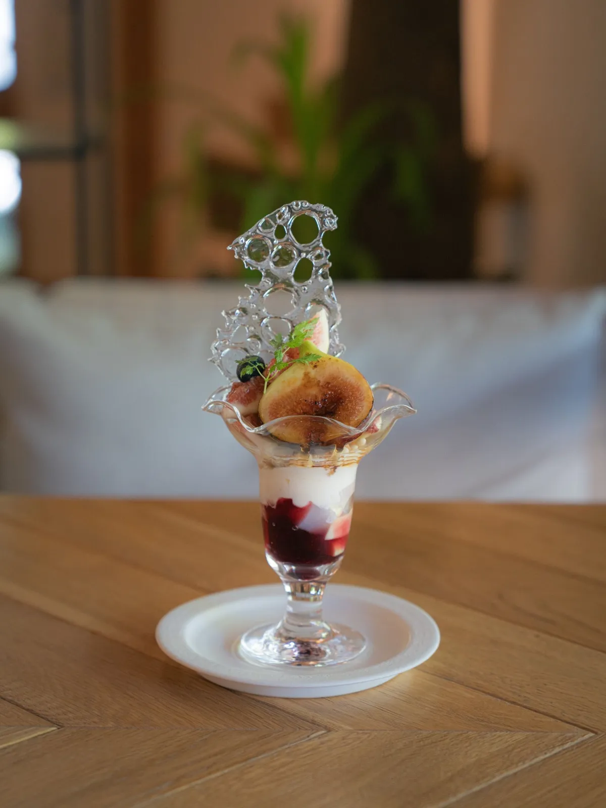 このパフェの最大の魅力は、その組み合わせです。やわらかいいちじくのやさしい甘み、クリーミーなピスタチオのコク、そして、仕上げに振りかけられたブラックペッパーがこのパフェを一際特別な存在にしています。スパイシーなアクセントが加わることで、奥深い味わいが引き出されています。