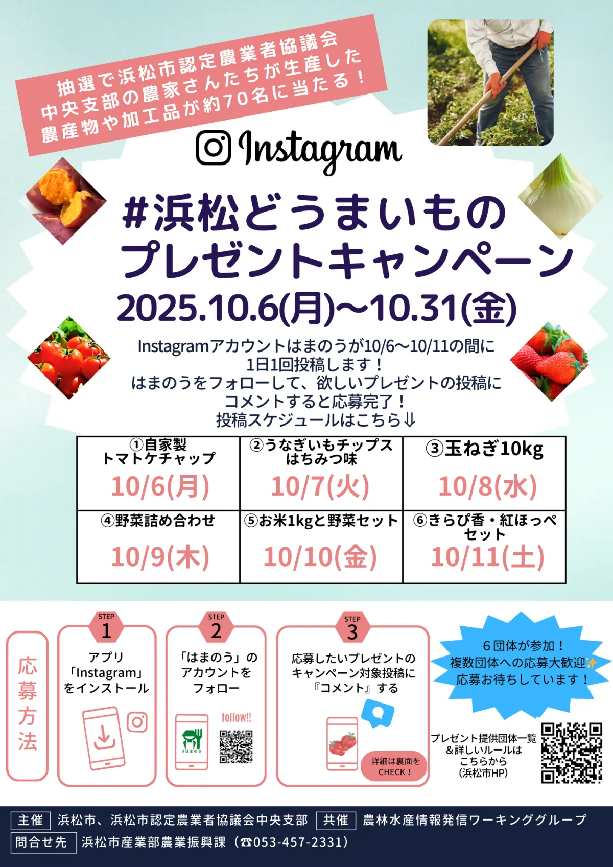 このプレゼントキャンペーンは、浜松市のインスタグラム公式アカウント「はまのう」と、浜松市認定農業者協議会中央支部の共同企画として実施されます。約70名に当たるチャンスがあり、参加者は6つの農業団体から提供されたこだわりの農産物や加工品をゲットできます。