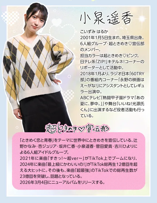 小泉遥香さんは2001年生まれの埼玉県出身で、6人組のアイドルグループ「超ときめき♡宣伝部」のメンバーとしても知られています。彼女の担当カラーは「超ときめき♡ピンク」であり、日テレ系の「ZIP!」内のリポーターや、ラジオのアシスタントとしても幅広く活躍しています。