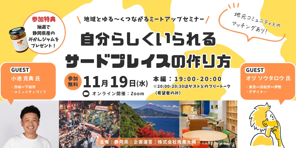 静岡で開催されるオンラインイベントは、地方での暮らしについて考える絶好の機会です。「地方で面白いことをしたい!」「ゆるくつながれる地域を探している」という方に向けて、多拠点居住やサードプレイスの作り方に焦点を当てたトークイベントが行われます。これからのライフスタイルを考える上で、ぜひ参加してみてください。