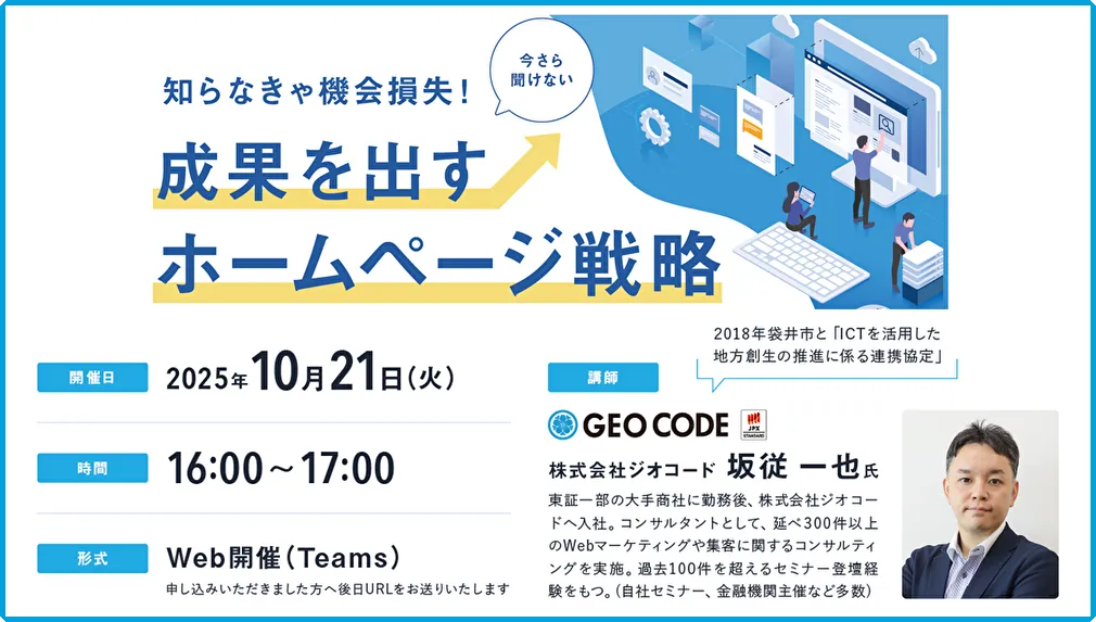 2025年10月21日、静岡銀行が主催するセミナー「知らなきゃ機会損失!成果を出すホームページ戦略」が開催されます。このセミナーでは、株式会社ジオコードの取締役である坂従一也氏が登壇し、成功するホームページの運用法について詳しく解説します。