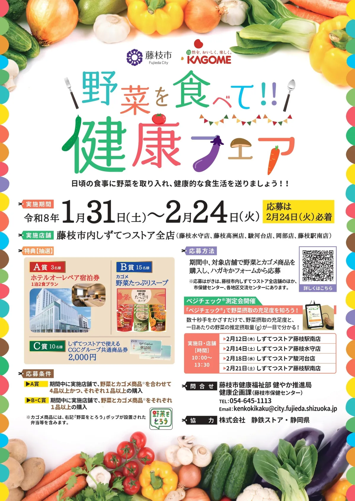 静岡県内で「野菜を食べて!!健康フェア」が開催されます。このイベントは、日々の食生活の中で野菜の摂取を促進し、健康的なライフスタイルをサポートすることを目的としています。静岡県とカゴメ㈱、そしてしずてつストアが連携し、地域の皆様に特典をもたらします。イベントは2021年1月31日(土)から2月24日(火)までの期間中、市内のしずてつストア全店で行われます。