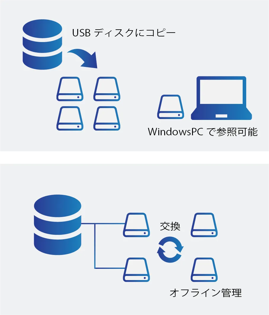USBディスクと書き込み用PCがあれば導入準備が完了し、特別なIT知識は一切不要。医療従事者がアクセスしたいデータを簡単に参照できるため、運用時の負担を大幅に軽減します。各医療機関が自ら設定した認証機能や暗号化機能を用いることで、データの保護面も強化されます。