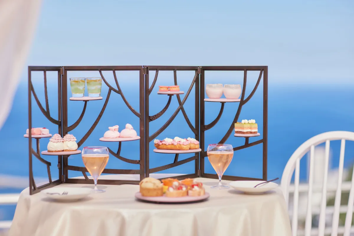 リゾナーレ熱海の最上階テラスでは、熱海の美しい街並みと青い海を一望できる特等席が用意されています。ここでは、早咲きから遅咲きの梅をテーマにしたアフタヌーンティーが楽しめます。特別な装飾が施されたこの空間で、春の訪れを感じながら、心ゆくまでスイーツを堪能できるのです。